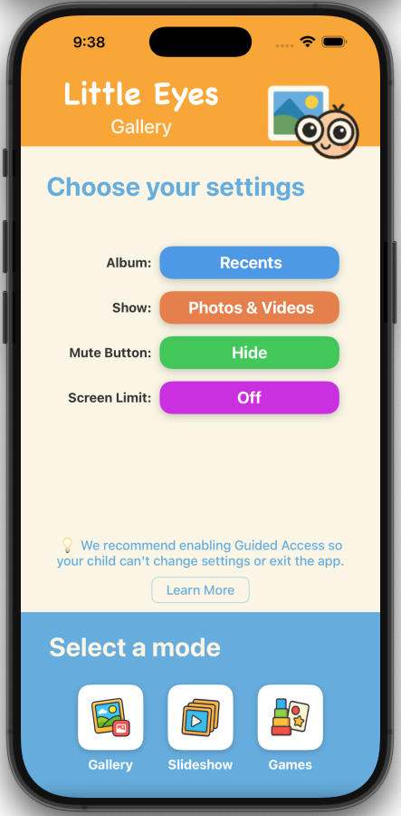 Stop worrying about handing over your phone for kids to see photos. Little Eyes Gallery keeps your photo library safe while giving children a fun, engaging way to explore family memories.